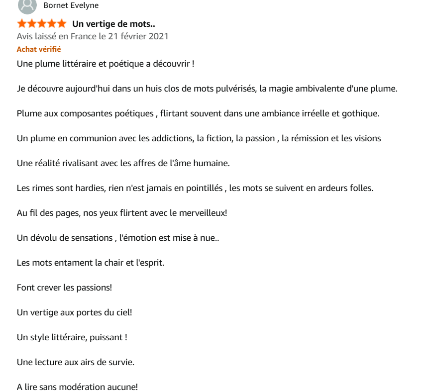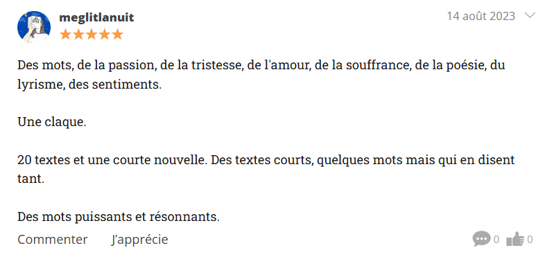 Ci-dessous une sélection de vos plus beaux retours de lecture. Vous pouvez aussi laisser un commentaire directement sur cette page en guise d’avis !